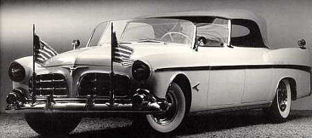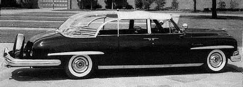 This car was used as a presidential limousine from 1953 to 1960. Chrysler retained ownership of the car while it was at the White House. It has a Derham body, bulletproof glass, bombproof floors, divider glass, four-wheel disc brakes, and a hugh factory air conditioning unit in the trunk. |