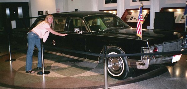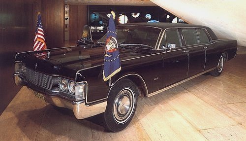 This from a postcard from the LBJ Library and Museum in Austin, Texas. The description on the card states that it was presented by the Ford Motor Company and was used in Washington, then in Austin. Equipped with security communications, radio, telephone, and television. A large soundproof passenger compartment also provided ample space for discussion in transit. ![]() |