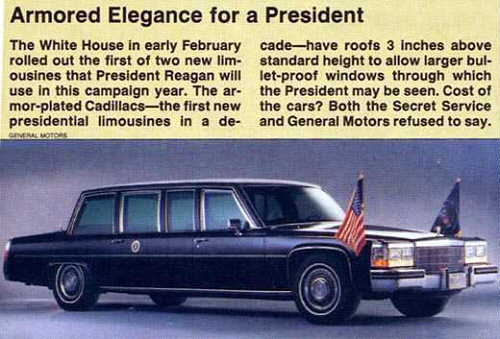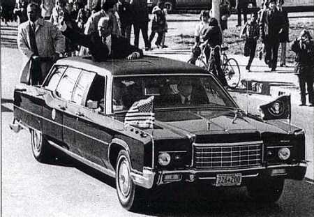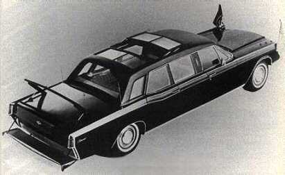 In 1974 Ford supplied another Continental, a 1972 model which was stretched out to 22 feet long, was armor plated, outfitted with bullet resistant glass and powered by a 460 cu. in. V8. This limousine was used by Presidents Ford, Jimmy Carter, and Ronald Reagan. and George H. W. Bush. It is on display at the Henry Ford Museum. ![]() |
